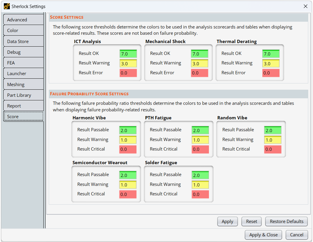 Use the Score Settings dialog box to set threshold levels for score-related results. (For changing the scoring color codes, see Color Settings.) The Score dialog box has two panels, each representing a specific type of scoring: The top panel, Score Settings, applies to ICT Analysis, Mechanical Shock, and Thermal Derating. The bottom panel, Failure Probability Score Settings, applies to Harmonic Vibe, PTH Fatigue, Random Vibe, Semiconductor Wearout and Solder Fatigue. See Scoring Systems: Updated and Legacy for an explanation of the two scoring methods.