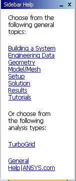 In addition to having a visual layout that guides you through completing your project, you can also access Sidebar Help by pressing F1 while the mouse focus is anywhere on Ansys Workbench. Sidebar Help is a dynamically generated set of links to information appropriate for helping you with questions you have about any of the tools and systems you currently have open.