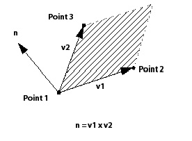 The normal vector to the plane is calculated using the right-hand rule. The first vector is from Point 1 to Point 2 and the second is from Point 1 to Point 3 as shown in the diagram below.
