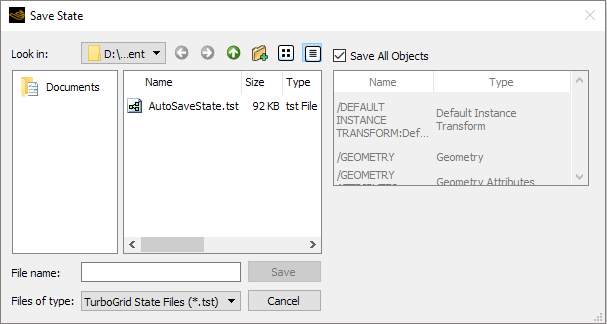 In the list on the right side, select the objects to include in the state file, or select Save All Objects. If Save All Objects is selected, the current state of all objects is written to the state file. If Save All Objects is cleared, select the objects to save to the state file by clicking on each object. The current state of all selected objects is written to the state file.