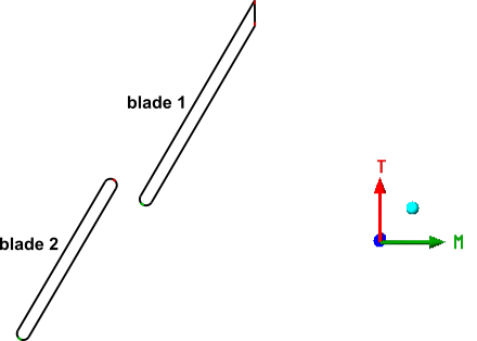 The leading edge of the second blade is positioned, in the meridional direction, near or behind the trailing edge of the first blade. The second blade should be offset by approximately half a blade pitch (in the theta direction) compared to the first blade. The leading and trailing edges of the first blade and second blade are rounded. You must choose one of the two templates. For details, see Choosing the Appropriate TandemVaneAligned Template. |