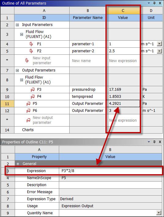 Expression field in the Properties pane (after selecting the parameter in the Outline pane)