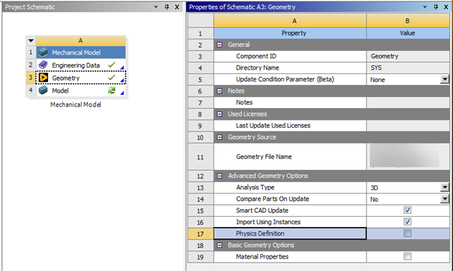 Note: To use a Mechanical Model system as an upstream system in a model-model assembly workflow, you must disable the property in the Geometry cell.