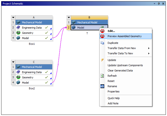 You can quickly preview the orientation of your parts in an assembly by right-clicking on the downstream model cell and selecting Preview Assembled Geometry. When using this feature, Mechanical assembles the geometry only (computationally expensive items such as the mesh are not assembled), allowing you to review the assembled geometry quickly. This feature is useful if you are unsure about the relative positioning of your subassemblies and some transformations are required for proper alignment.
