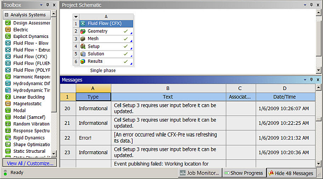 During any update (cell, system, project, design point, multiple design point), any messages that are generated are displayed in the Messages pane. The Messages pane opens automatically if an error message occurs during an update, but in other situations you must open it manually.