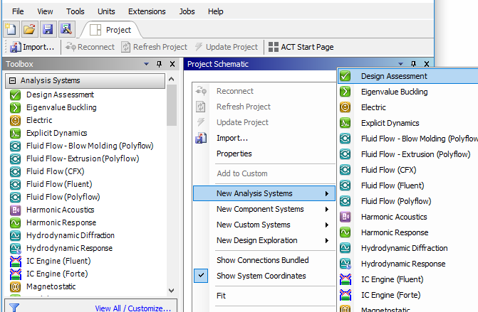 The context menu includes a list of available systems, divided into categories. From this list, you can browse and select a system to add to the Project Schematic.