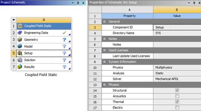 To add a Coupled Field Static analysis system, drag the system from the Toolbox to the Project Schematic or double-click the system in the Toolbox.