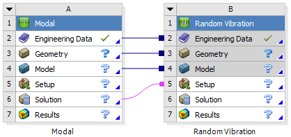 This template creates two systems, a Modal analysis system that transfers data into a Random Vibration analysis system. The two systems share Engineering Data, Geometry, and Model cells. The Modal solution provides the necessary solver files as input to the Random Vibration Setup cell.