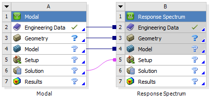 This template creates two systems, a Modal analysis system that transfers data into a Response Spectrum analysis system. The two systems share Engineering Data, Geometry, and Model cells. The Modal solution provides the necessary solver files as input to the Response Spectrum Setup cell.