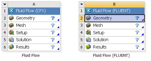 After introducing a new Fluid Flow analysis system to the project schematic and assigning it an appropriate name, the focus is typically directed to the Geometry cell, because this is usually the first cell in the system that requires user input. An example of both a CFX and a Fluent fluid flow system is shown below.
