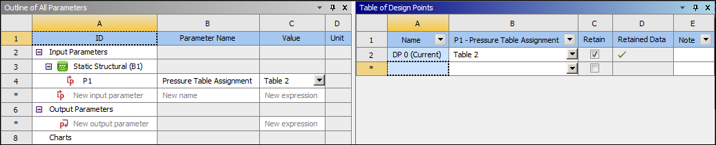 Each parameterized table represents a design alternative. Workbench automatically creates an initial design point (DP0) for the parameterized table. To investigate different boundary condition loads, add more design points and assign different tables to them. See Working with Design Points.
