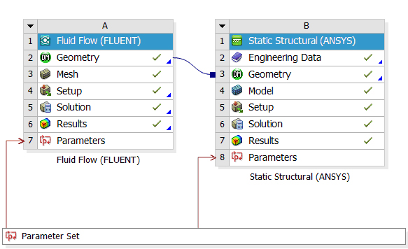 A finished project that includes a Fluid Flow (Polyflow Classic) system (FFF), a Mechanical application system (MECH), and parameters (DesignXplorer) might look like this:
