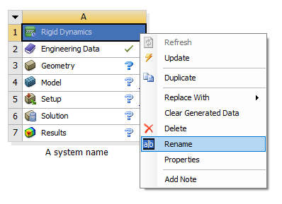 Contents Updating Systems | Naming and Renaming Systems | Print page Renaming SystemsYou can change the system name again after it has been named.To rename a system:Double-click the system name or right-click the system header and select Rename from the context menu.Type the new single or multiple line name.Press Enter. « Naming Systems Duplicating Systems »