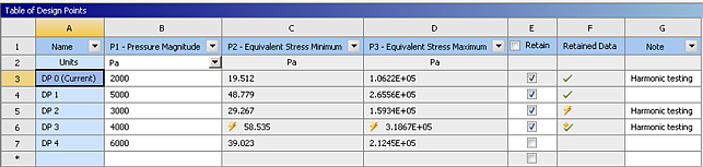 You can verify that data has been retained by viewing the icon in the Retained Data column for each design point. This icon indicates the availability, validity, and state of the retained data for the design point.