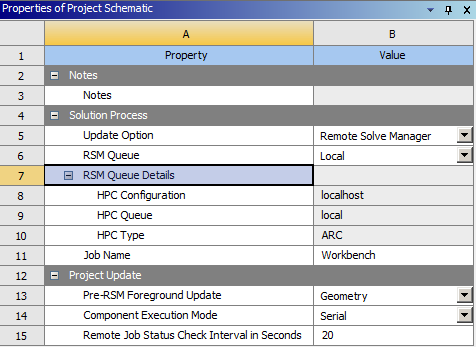 When performing a design point update in RSM with component update in the foreground, the Parameter Set properties override the parallel-process settings in individual components. For details on updating design points, see Updating Design Points in Remote Solve Manager.