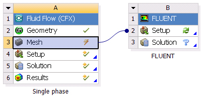 The cells already connected to the Mesh cell transition to the refresh required state after the Mesh cell is updated. Updating the project unnecessarily re-updates the previously up-to-date cells (CFX Setup, Solution, and Results). We recommended that you establish the connection to the Fluent system before updating components downstream of the Mesh in the Fluid Flow (CFX) system.