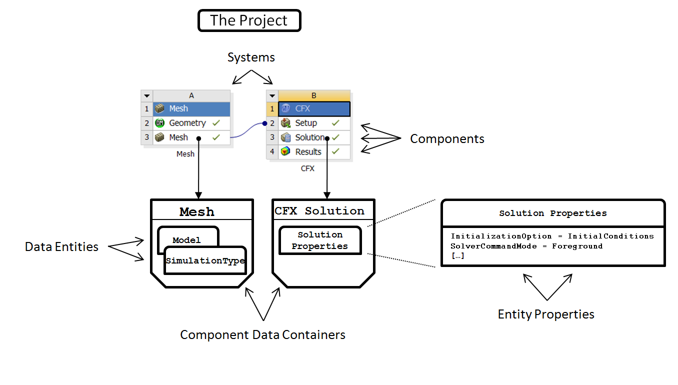 You should understand the following terms and concepts when working with Ansys Workbench scripting. The following image depicts the relationship between the objects in a project.