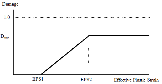 This damage factor is used to reduce the elastic moduli and yield strength of the material as the calculation proceeds. In the standard model damage is represented by a parameter D which is zero for all plastic deformation for which the effective plastic strain is less than a value EPS1. When the strain reaches a value of EPS1 the damage parameter D increases linearly with strain up to a maximum value Dmax (<1) at a value of the effective plastic strain EPS2, as shown in the following figure.