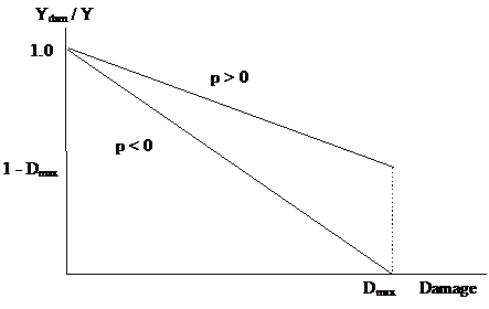 To describe the progressive crushing of a material the damage function is used to reduce the material’s strength. Fully damaged material has some residual strength in compression but none in tension. The current value of the damage factor D is used to modify the bulk modulus, shear modulus and yield strength of the material.