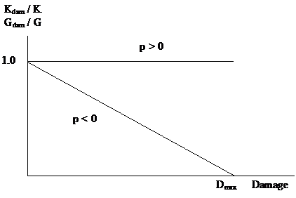 The bulk modulus and shear modulus are unaffected in compression, while in tension they are progressively reduced to zero when damage is complete. In tension therefore they are both reduced by the factor (1 - D/Dmax) as shown graphically in the figure below.