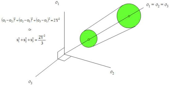 This model uses the original von-Mises premise that the yield stress has a constant value. Consequently, the von-Mises cylinder has a fixed radius. States lying inside the cylinder are elastic. States on the surface of the cylinder are plastic.