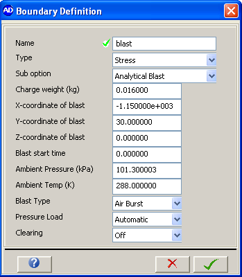 An Analytical Blast boundary condition can be defined and applied to parts in the same manner in which a stress boundary would be. The blast boundary condition parameters that need to be specified are as shown below.