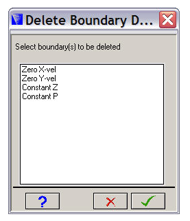 Contents Boundaries | Print page 9.2. Boundaries - DeleteThis window lets you delete Boundary Conditions from your model. Select the Boundary Condition(s) you want to delete and click . « 9.1. Boundaries - New/Modify 9.3. Analytical Blast Boundary Condition »