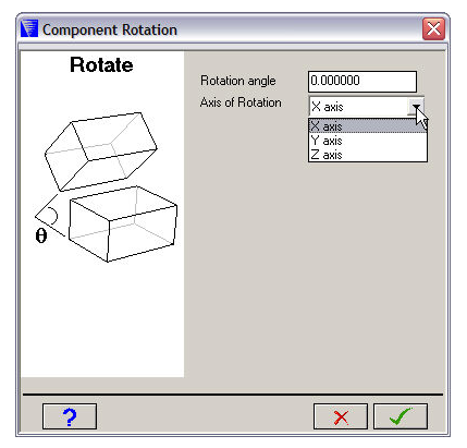 Contents Components | Print page 11.10. Components - RotateThis window lets you rotate all Parts of the selected Component about an axis in XYZ space.RotationThe rotation angle in degrees.X/Y/Z-axisThe axis about which the Component will be rotated. « 11.9. Components - Translate 11.11. Components - Scale »