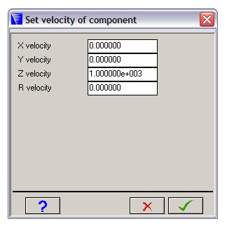 Contents Components | Print page 11.5. Components - VelocityThis window lets you assign a velocity to all Parts of the selected Component.Enter the velocity components in the fields provided and click . « 11.4. Components - Material 11.6. Components - Initial Conditions »
