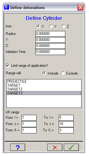 This window lets you define a detonation cylinder (detonation propagates radially inward and outward from the surface of the cylinder).