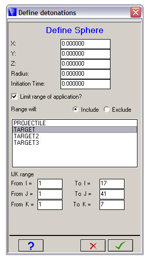 This window lets you define a detonation sphere (detonation propagates radially inward and outward from the surface of the sphere).
