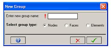 Contents Groups | Print page 12.1. Groups - NewThis window lets you create a Group.Group NameThe Group name.Group TypeSet either a node, face, or element Group type. « Chapter 12: Groups 12.2. Groups - Rename »