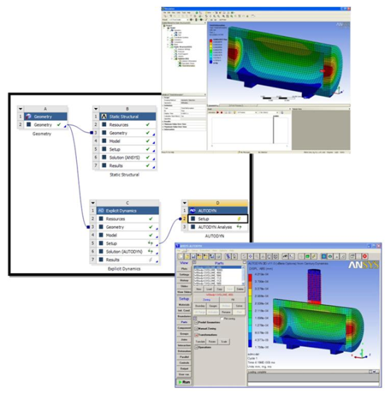 Autodyn explicit analysis can be initialized (or pre-stressed) with the results from either a linear static structural, non-linear static structural or transient dynamic Ansys Mechanical implicit analysis. Note that this feature requires the Ansys results to be saved to a .rst file.