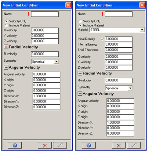 Select this option if you want your Initial Condition Set to include velocities and a material and its associated variables (top right window)