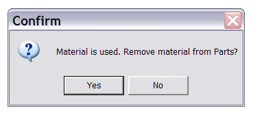 If the material you want to delete has been assigned to one or more Parts, you will be asked to confirm that it is OK to remove the material from the Part(s):