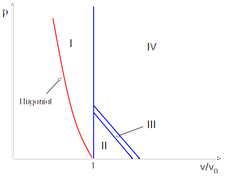 The region to the left of the Hugoniot can only be reached by adiabatic (non-shock) compression and is not relevant to impact problems. It is therefore excluded from the formulation.