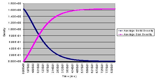 The pressure of the solid is evaluated using a separate equation of state, which is user defined and can be either a linear or a compaction EOS. As the solid material burns it changes state such that when the cell is fully burned only gas is present within the cell. A typical density variation in time is shown below,