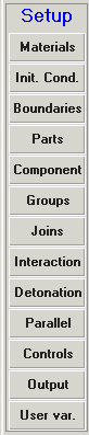 The lower group of buttons (Setup) let you access dialog panels to set up your model. Starting at the top button (Materials) and working down to the Run button, you can build your model in the most efficient and logical way :