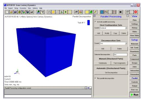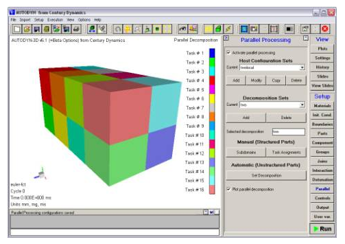 The automatic decomposition algorithm also incorporates Euler parts, Ideal Gas as well as Multi-material, in addition to its ability to handle unstructured grids. This facilitates the decomposing of complicated Euler/Lagrange coupled models—you need only stipulate the number of tasks over which the model should be assigned and Autodyn will automatically produce a decomposition configuration with good load balancing qualities and minimal inter-processor communication. Furthermore, to further enhance the efficiency of coupled calculations the subdomains of the Lagrange structure will be placed on the same processor, so decreasing the necessary inter-processor communication.