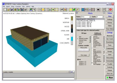As previously stated, the new algorithm allows easy decomposition of complicated coupled models which include Euler and unstructured Lagrange Parts. The model below contains a brick structure in which an explosion is occurring. The brick structure is modeled using Lagrangian parts, while the explosion in air is modeled using an Euler part. Here, only the lower region of the Euler part is shown for illustration purposes; the Euler part extends above the brick structure.