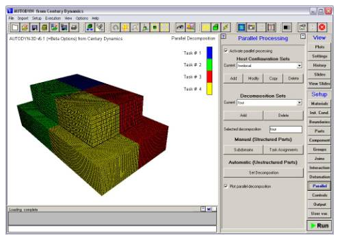 By choosing decomposing the model over 4 tasks, the various parts can be assigned to the available processors whilst ensuring efficient parallel computations: