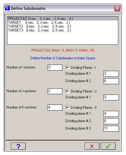 Enter the I, J and K values for the dividing planes in the three index directions (the default values place the dividing planes evenly through the grid).