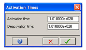 This window lets you set the activation and deactivation times for a structured Part. Activation / Deactivation times cannot be set for unstructured Parts. The default values ensure the Part is active for the entire calculation.