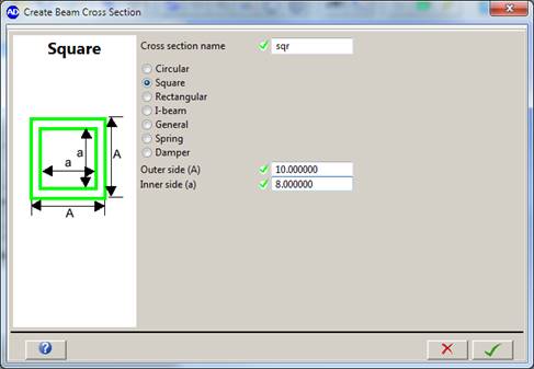 The available cross sections are Circular, Square, Rectangular, I-beam and General beam, as well as Spring and Damper cross section definitions to model springs and dampers using beam parts.
