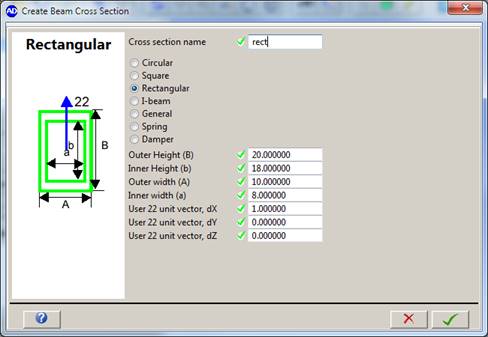 Rectangular – Outer and inner height and width of the rectangular cross section needs to be defined, as well as the unit vector 22.