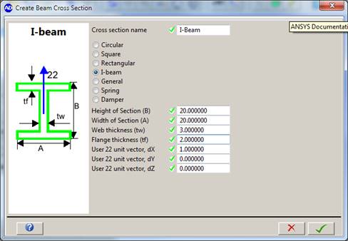 I-beam – Height and width, and thickness of web and flange of the I-beam needs to be defined, as well as the unit vector 22.