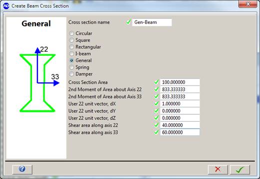 General – The cross section area, the 2nd moment of area about axis 22 and 33, the unit vector 22, and shear area along axis 22 and 33 need to be defined.