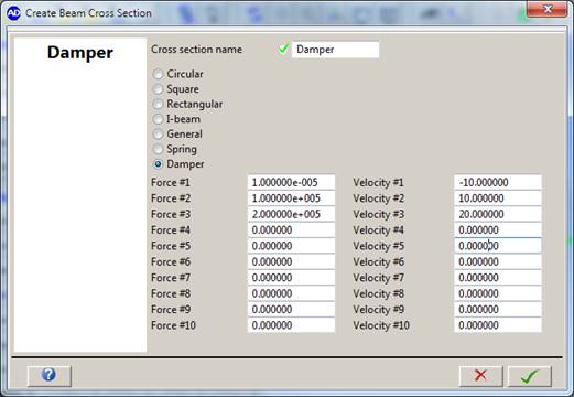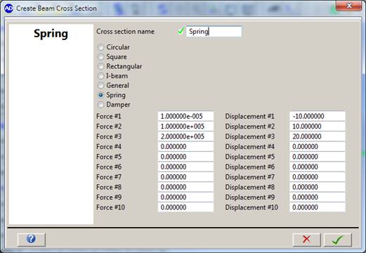 For a spring, the cross section needs to define a 10 point piecewise linear force-displacement behavior.