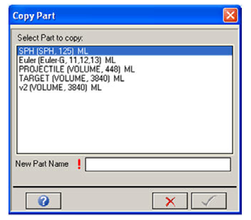 Contents Parts | Print page 10.2. Parts - CopyThis window lets you copy an existing Part to a new Part. Part ListLists all the existing Parts in your model. Select the part you want to copy from this list. New Part NameThe name of your new Part.Clicking creates your new part. « 10.1.9. Parts - New - Fill Part (3D Shell) 10.3. Parts - Delete »