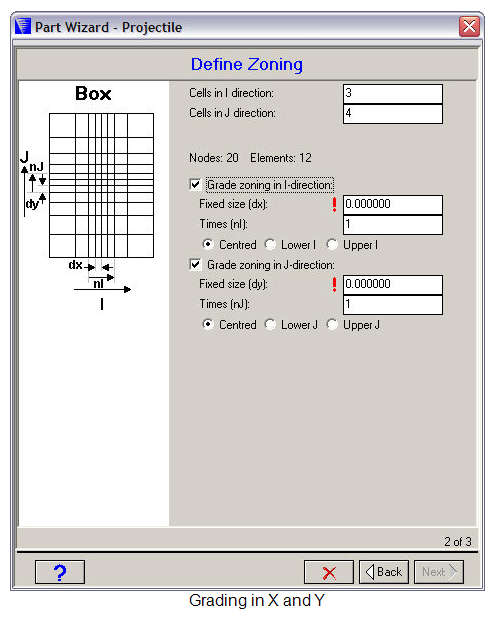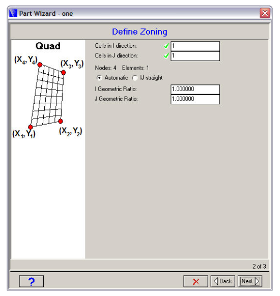 The number of cells (elements) you want to use in the I and J directions. The corresponding number of nodes and elements required for your part will be displayed below.